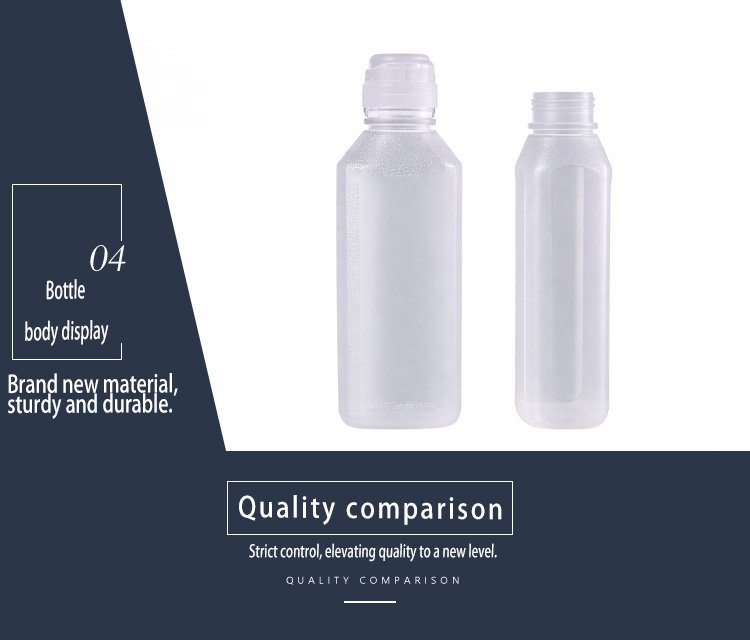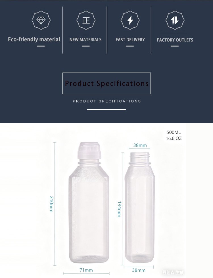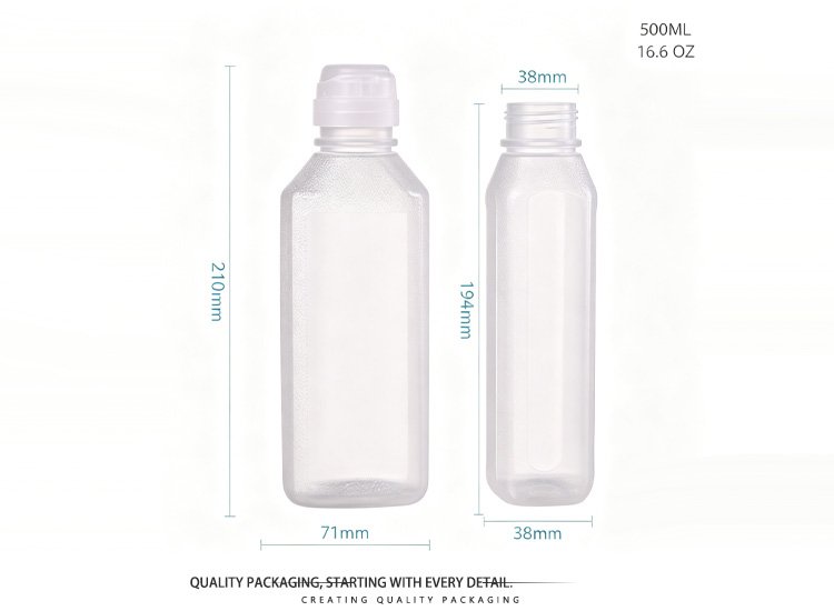 This 500ml food-grade PP oil bottle is designed for versatile kitchen use, featuring a sleek, matte frosted finish that resists fingerprints and oil stains for a consistently clean look. Made of durable, BPA-free polypropylene, it is heat-resistant and safe for storing cooking oils, vinegars, sauces, dressings, and more. The bottle comes with a standard 38/400 neck finish, compatible with most common flip-top or squeeze caps for easy pouring and leak-proof sealing. Its compact, square-shaped body is space-efficient, fitting neatly in cabinets or fridge doors, while the semi-transparent design lets you easily monitor liquid levels. Lightweight yet sturdy, this oil bottle is a practical and stylish upgrade for any home or commercial kitchen.